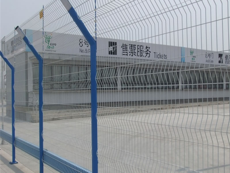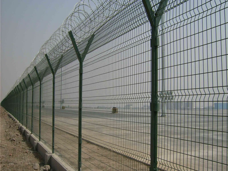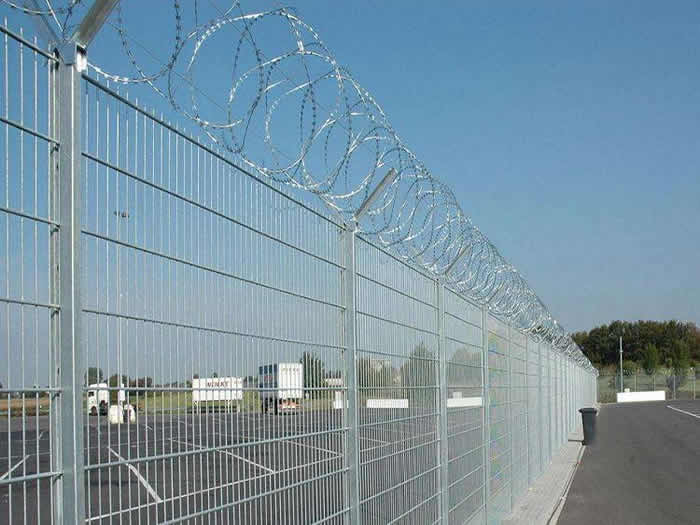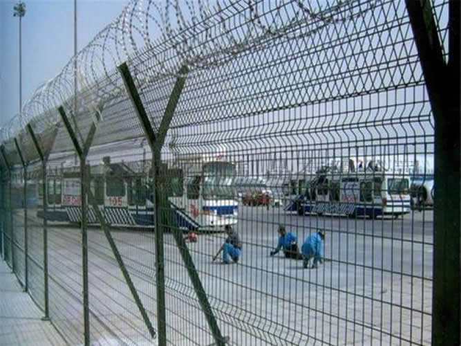 網(wǎng)片中帶有V型加強(qiáng)筋,可大大增強(qiáng)圍網(wǎng)的抗沖擊力。立柱為60×60的矩形鋼,頂端焊有V型支架,或者采用70×100mm的掛式連接立柱。以上產(chǎn)品均為熱鍍鋅后采用高質(zhì)量的聚酯粉末經(jīng)典噴涂,采用國(guó)際流行的RAL顏色,在雙層的優(yōu)質(zhì)防腐處理后,可達(dá)十年的超長(zhǎng)壽命。圍網(wǎng)頂部加上熱鍍鋅刀片刺絲(BTO)后又很好的增加了安全防護(hù)性能,也更具美觀性,中國(guó)首都機(jī)場(chǎng)等大型機(jī)場(chǎng)已廣泛使用此種產(chǎn)品,并得到極大認(rèn)可。