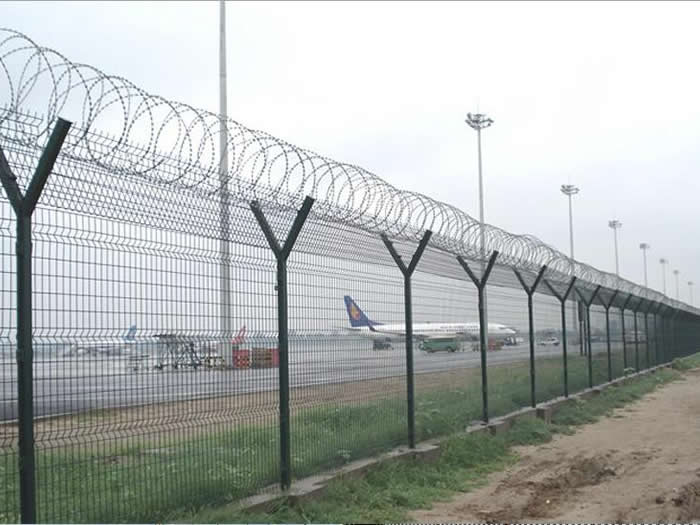 機(jī)場(chǎng)護(hù)欄網(wǎng)采用5.0mm高強(qiáng)度低碳鋼絲焊接。網(wǎng)孔:50×100mm或者50×200mm。
